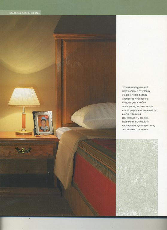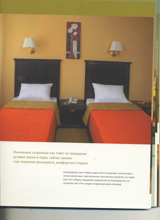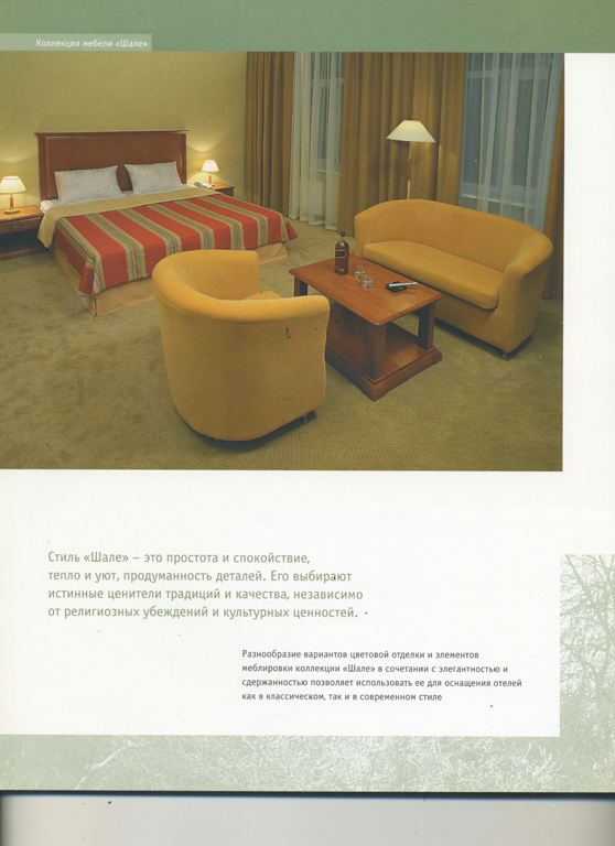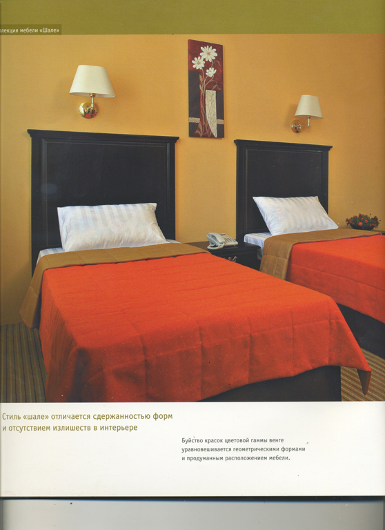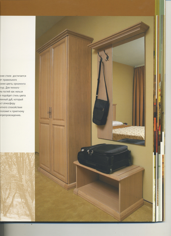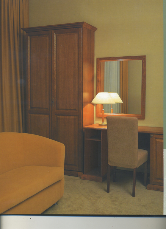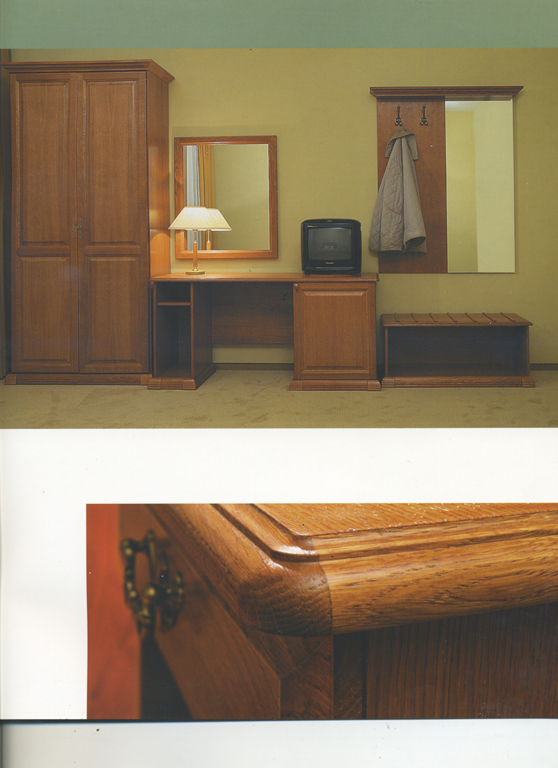 Уютная и стильная обстановка номера создаётся во многом за счёт продуманной меблировки. ЗАО Молодечномбель изготавливает для Вас под заказ мебельные комплекты и отдельные модули. Таким образом, вы можете самостоятельно сочетать интересующие вас предметы интерьера или остановиться на комплексном решении предложенным нашими разработчиками.