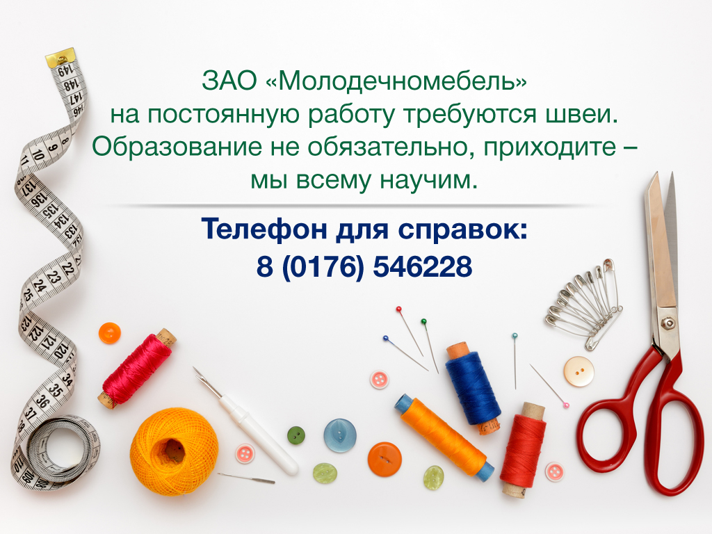 ЗАО»Молодечномебель» на постоянную работу требуются швеи.Образование не обязательно, приходите — мы всему научим.