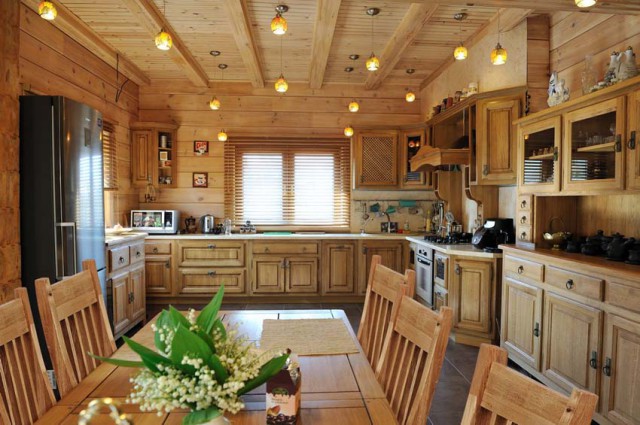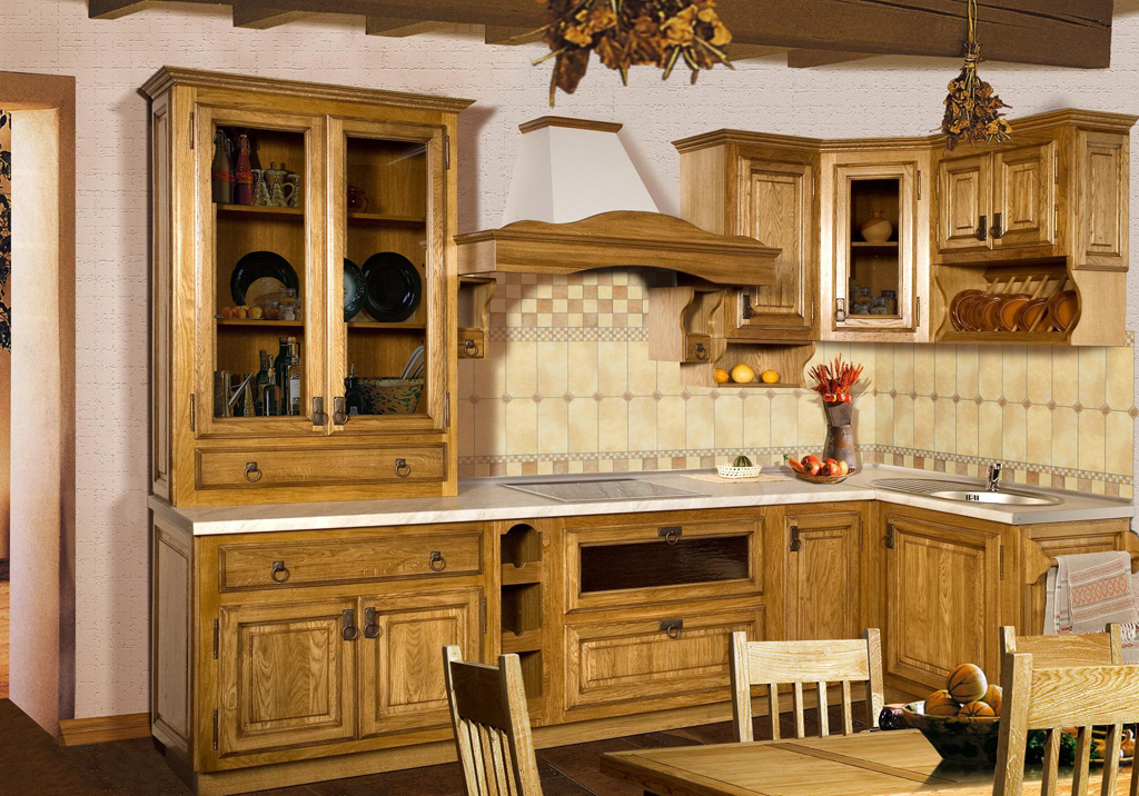 Дополнить кухонный гарнитур можно массивным дубовым столом, стульями и табуретами, а также диваном и креслом с обивкой из гобелена.