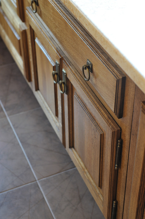 Фасады кухни полностью изготовлены из массива дуба в оттенке «античный воск с патиной». Обработка воском придает дереву удивительный, как будто «светящийся изнутри» свет. Такое покрытие позволяет сохранить светлый оттенок натуральной древесины. Структура дерева при этом становится яркой и полностью подчеркивает свою природную красоту.