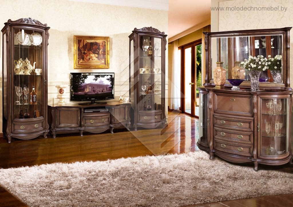 Гнутая рамочная конструкция фасадов подчёркивается «косичкой» выполненной на цельной древесине, методом горячей накатки. Вертикальные декоративные бруски из массива дуба, с резьбой выполненной ручным способом, поэтому каждый набор является уникальным и неповторимым.