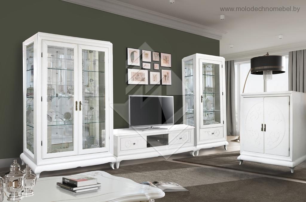 Набор выполнен с использованием массива дуба и шпона на лицевых поверхностях. Украшает набор витиеватая инкрустация деревом по дереву, повторяющаяся в каждом изделии, что всё вместе создаёт единую композицию, показывает индивидуальность и неповторимость набора. Цокольное основание изделий на профильных ножках, приподнимает изделия над поверхностью, придавая им лёгкость и радуя глаз. В ящиках вкладыши облицованные тканью. Стеклянные филёнки с декоративным узором. Тумба с откидной стеклянной дверью.