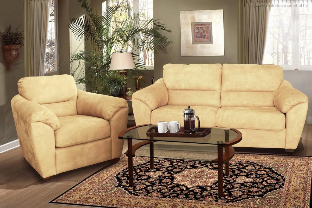 Набор понравится тем, кто любит и ценит строгую сдержанность безо всяких излишеств, лишь декоративные пиковки и искусственно созданные складки придают набору мягкость и уют, манят отдохнуть от повседневных забот. Кресло и диваны облицовываются кожей натуральной или тканью. Диваны угловые облицовываются только тканью. Сиденье цельное, съёмное с имитацией деления на две части, наполнитель пенополиуретан эластичный, подушек спинки — волокно полиэфирное.