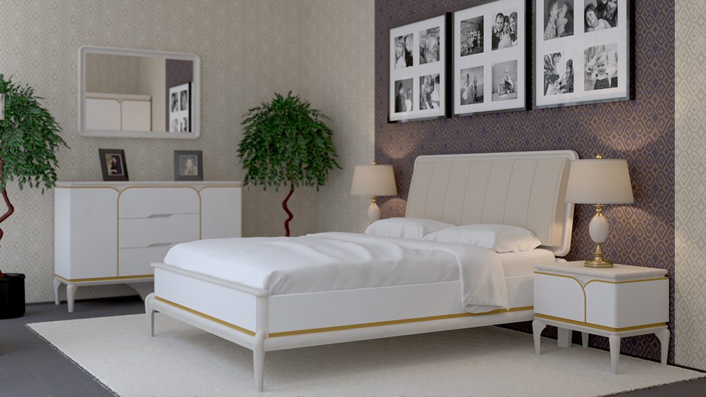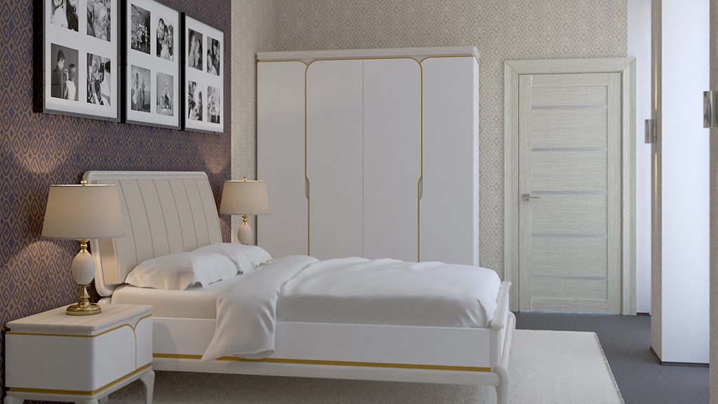 «Алеко» — это плавность линий и изящество форм, отсутствие острых углов и мягкое сочетание двух светлых тонов: деталей из массива и шпона дуба в цвете «Дуб жемчужный» с фасадами в цвете «Айвори» с отделкой под золото, подчёркивающей образ изделий.