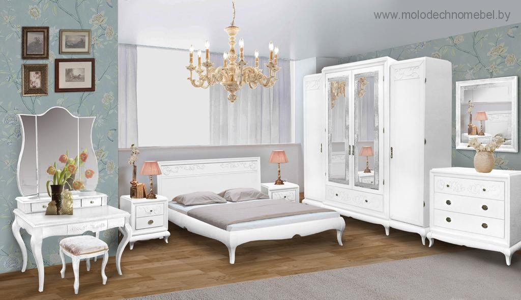Набор выполнен с использованием массива дуба и шпона на лицевых поверхностях. Украшает набор использование двух контрастных цветов (светлый цоколь, тёмный верх), витиеватая инкрустация деревом по дереву, повторяющаяся в каждом изделии, что всё вместе создаёт единую композицию, показывает индивидуальность и неповторимость набора. Цокольное основание изделий на профильных ножках, приподнимает изделия над поверхностью, придавая им лёгкость и радуя глаз. Зеркало навесное квадратной формы с рисунком по периметру. В кровати на основание из брусков ложится рама с ламелями, возможно регулирование матраца по высоте, с помощью комплекта фурнитуры на царгах. В ящиках вкладыши облицованные тканью.