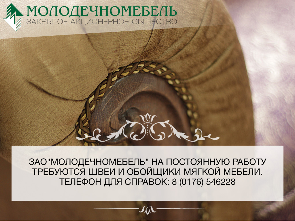 ЗАО»Молодечномебель» на постоянную работу требуются швеи и обойщики мягкой мебели. Телефон для справок: 8 (0176) 546228