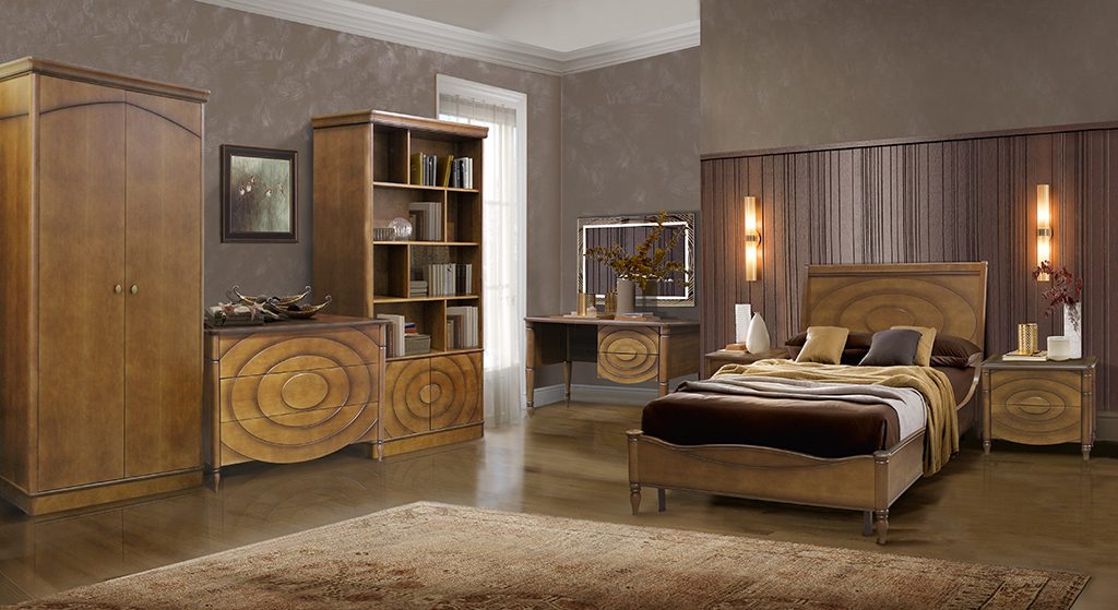 Кроме базовых предметов спальни (кровать, комод, шкаф и прикроватная тумба) в коллекции есть ещё другие: письменный стол, комбинированный шкаф и туалетный столик.